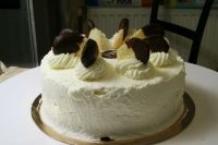 Die fertige Torte löse ich aus dem Ring, entferne den Kunststoffstreifen und streiche sie rundum mit Schlagobers (versetzt mit etwas Sahnstand) ein.