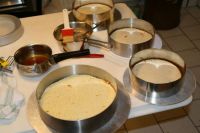 Für die Biskotten verwende ich das Rezept für Biskotten von Oberlaa. Als unterste Schicht setze ich einen Biskuitboden mit etwa 10mm Höhe ein (Biskuit für Torten von Oberlaa). Der Biskuitboden wird mit der gleichen Tränke getränkt, wie die Biskotten (Läuterzucker mit etwas Kaffee versetzt). Ich verwende sehr wenig Alkohol in der Malakoff. Das, wie auch der Kaffee in der Tränke, ist Geschmackssache.