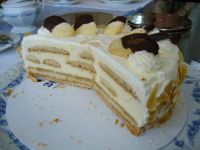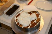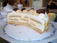 Heute will ich mal die Torte mit Biskuitstreifen umgeben, die so aussehen, wie viele aneinander gelegte Biskotten. So ähnlich machen die Franzosen das oft bei ihren Charlotten.