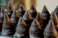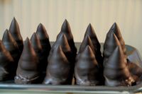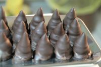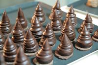 Setzen Sie mit der Creme kegelförmige Spitzen auf die Mürbeteigplätchen und überziehen Sie diese mit Schokolade.