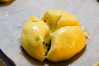 Nochmals kurze Teigruhe. Ev. nochmals mit Ei bestreichen und drei mal kreuweise einschneiden.
