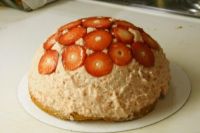 Herstellen aus einer Erdbeermousse oder einer Erdbeeroberscreme und einem Biskiutboden.