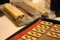 Mürbteig (ohne Kakaopulver) herstellen. Der Hälfte des Teiges das Kakaopulver zusetzen. Beide teile rasten lassen. z.B. 10mm dick ausrollen und in Streifen schneiden. Diese schachbrettartig zusammensetzen (mit Eigelb verkleben !).