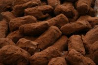 In Rechtecke schneiden, diese in der hohlen Hand mit Kuvertüre überziehen und in Kakaopulver absetzen/wälzen.