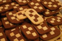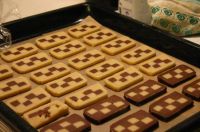 Mürbteig (ohne Kakaopulver) herstellen. Der Hälfte des Teiges das Kakaopulver zusetzen. Beide teile rasten lassen. z.B. 10mm dick ausrollen und in Streifen schneiden. Diese schachbrettartig zusammensetzen (mit Eigelb verkleben !).