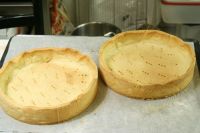Aus den genannten Zutaten einen Mürbteig bereiten und damit eine eher flache Form auskleiden und bei 180 blind backen. Auskühlen lassen.