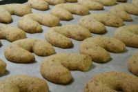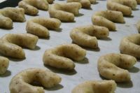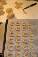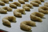 Hinweis: bei diesen "Kipferln" handelt es sich nicht um einen Irrtum. Ich habe dem Vorschlag des französischen Patissiers Christophe Felder folgend das mühsame Formen von Kipferln unterlassen und die geformten Teigwürste einfach in Stücke geschnitten und so auf das Blech gesetzt. Das tut dem Geschmack keinen Abbruch - und die Kekse können besonders mürbe hergestellt werden ohne zu zerbrechen.