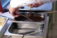 Geht die Kuvertüre aus, dann schmelze ich in einem anderen Gefäß weitere Kuvertüre auf, lasse sie etwas abkühlen und ergänze den Arbeitsbehälter damit.