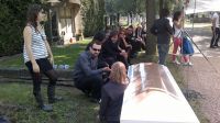 Am 29. und 30 Juli 2011 war es dann soweit. Zwei Drehtage am Wiener Zentralfriedhof: dort konnte ich meine Eignung zum Sargträger unter Beweis stellen. Der weiße Metallsarg wog zwischen 70 und 80 kg und mußte von 4 Sargträgern auf den Schultern getragen werden. Wohlgemerkt - ohne Inhalt. Mit dem "Harald Kramer" im Sarg wäre es für 4 Träger natürlich zu schwer gewesen. Deshalb hat sich "Harald" erst nach dem Abstellen des Sargs hineingelegt.